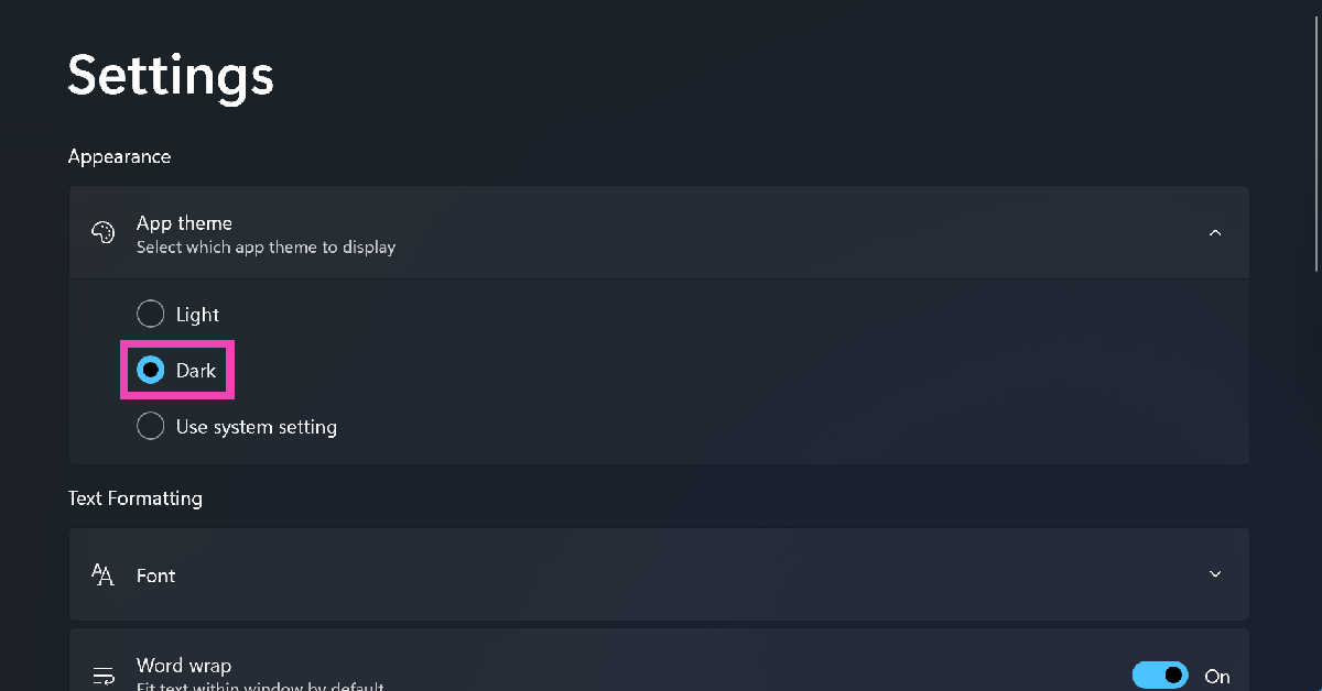メモ帳のコグホイールアイコンをクリックし、「アプリテーマ」カテゴリを展開し、暗い選択を選択します。