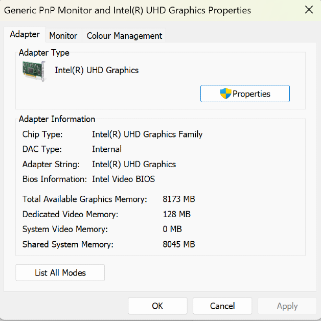 ステップ3:クリックしてくださいディスプレイ1用のディスプレイアダプタープロパティ。