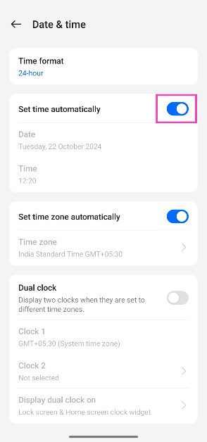 ステップ3:次のトグルスイッチをオンにします自動的に時間を設定します。
