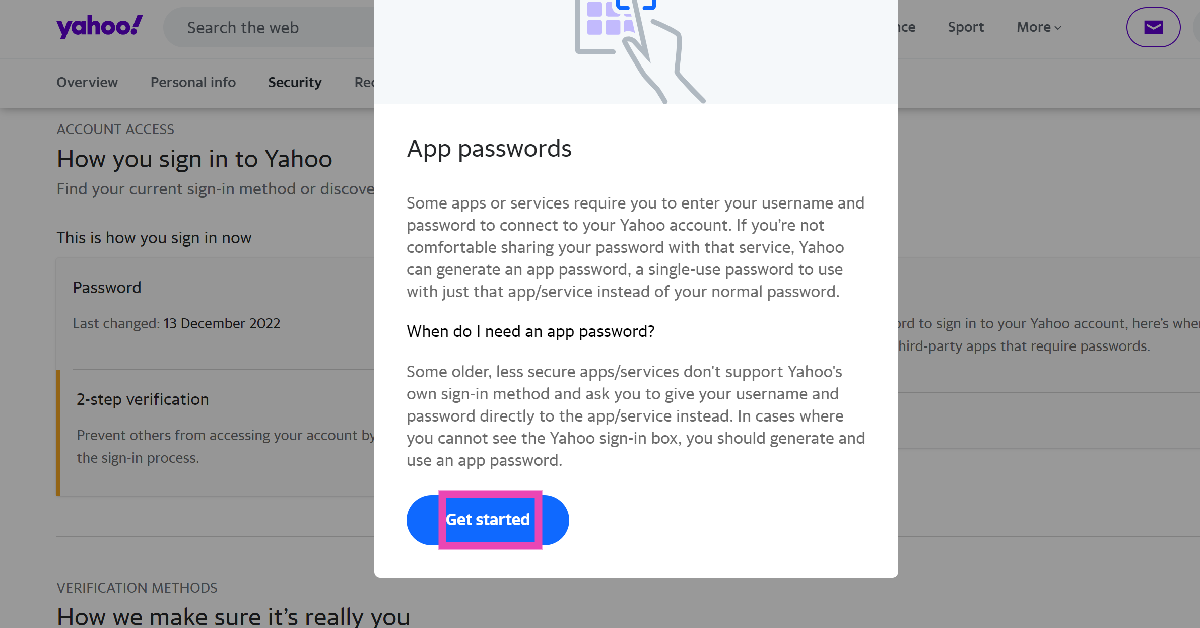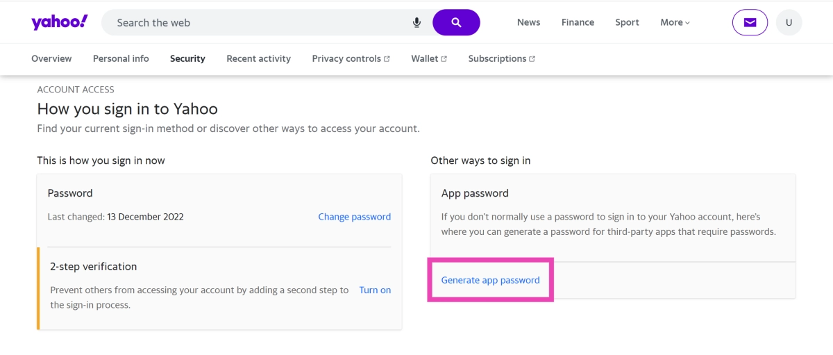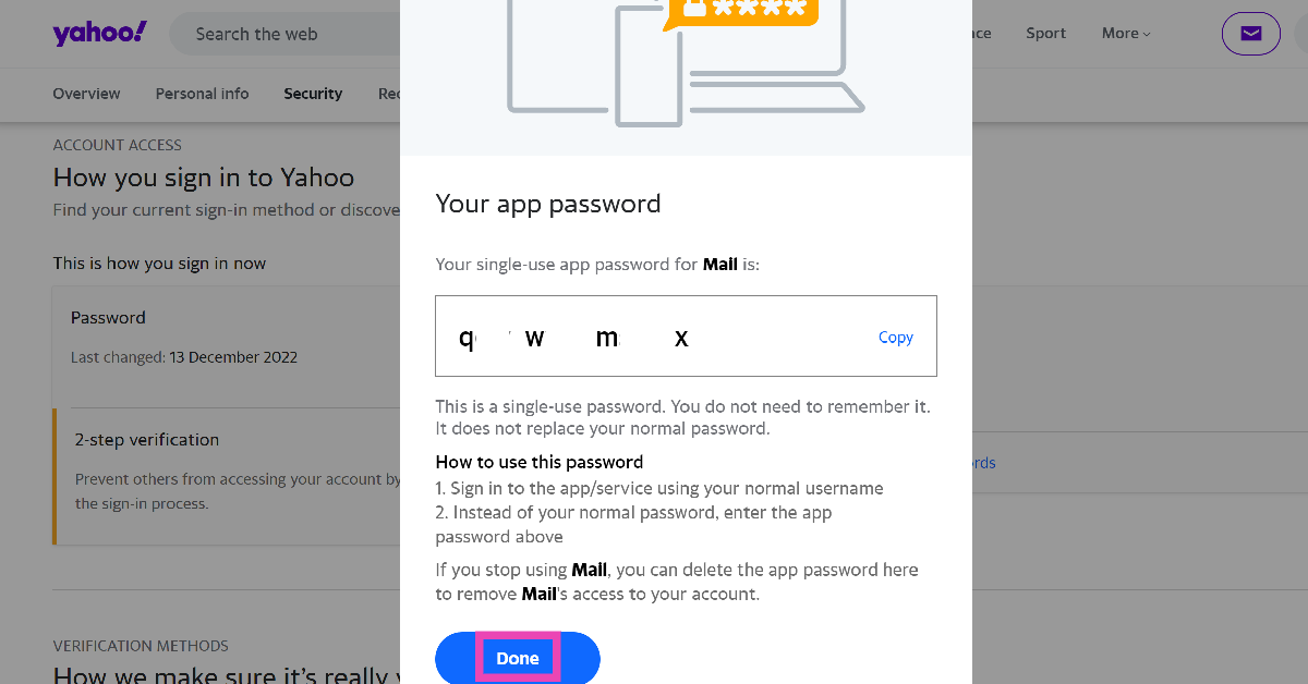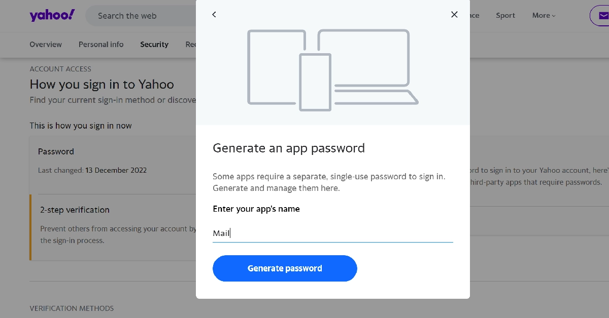 Yahooアカウントのセキュリティページに移動し、[アプリのパスワードを生成]をクリックし、アプリの名前を入力し、画面に表示されている単一使用パスワードをコピーします。