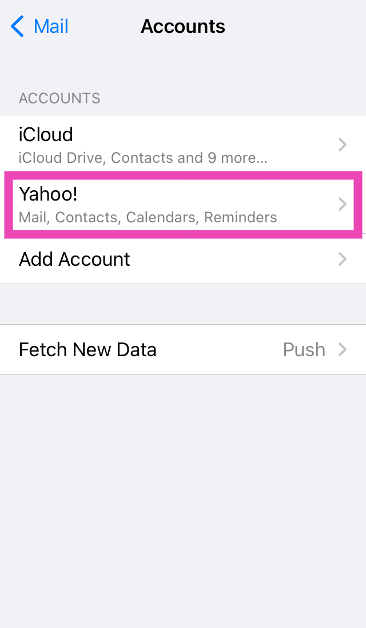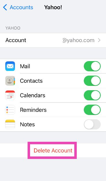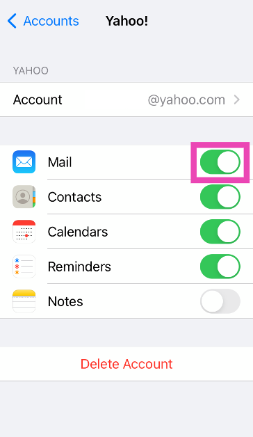 行きます設定>メール>アカウント> Yahoo適切な資格情報を使用してログインします。メールのトグルスイッチがオンになっていることを確認してください。