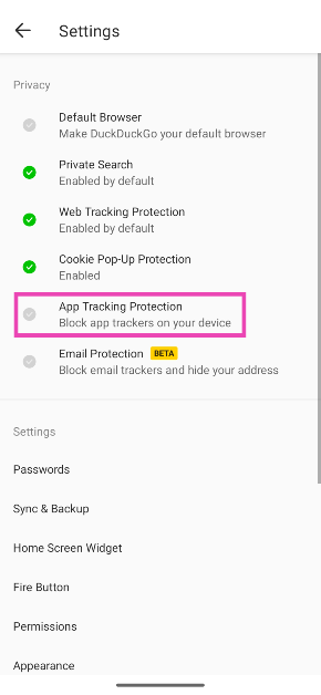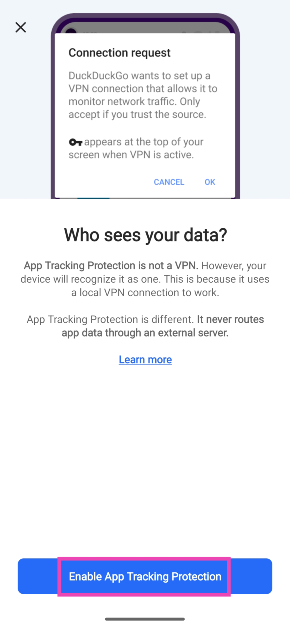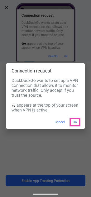 DDGを起動してください設定>アプリ追跡保護>有効化、およびWebブラウザがVPN接続を設定できるようにします。