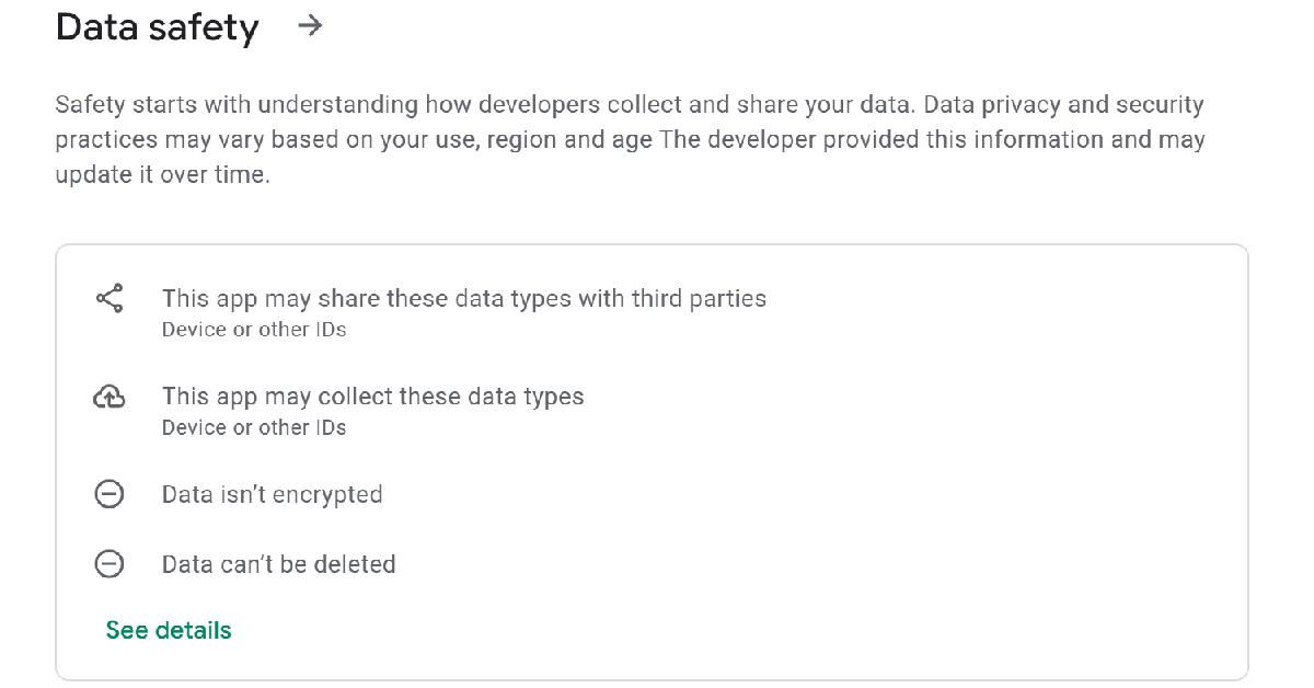 ユーザーがより良い選択をすることを奨励するために、Google Playストアには、プラットフォーム上のすべてのアプリに「データ安全性」カテゴリがあります。このセクションには、アプリが収集するデータ型と、他の第三者とデータを共有するかどうかをリストします。アプリのインストール中は、常にデータの安全性の詳細をご覧ください。無害な外観のアプリ(電卓、写真エディターなど)がサードパーティとデータを共有する場合は、代替案を探すことをお勧めします。