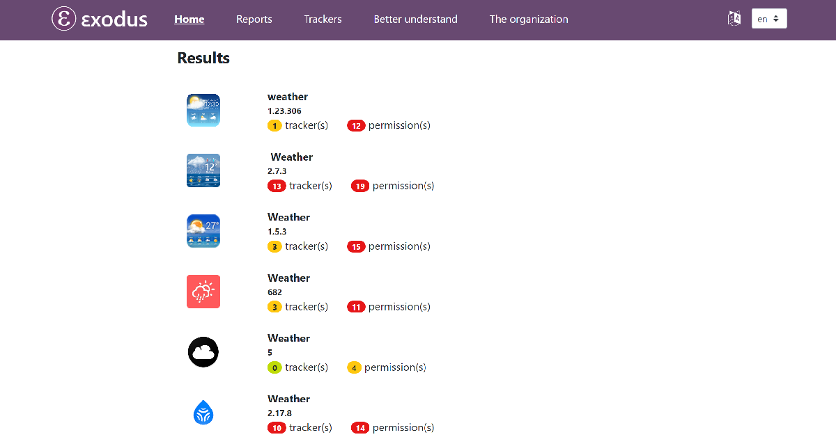 行きますhttps://exodus-privacy.eu.org/en/、アプリを検索し、関連する結果を選択します。アプリ内のトラッカーの数が表示されます。