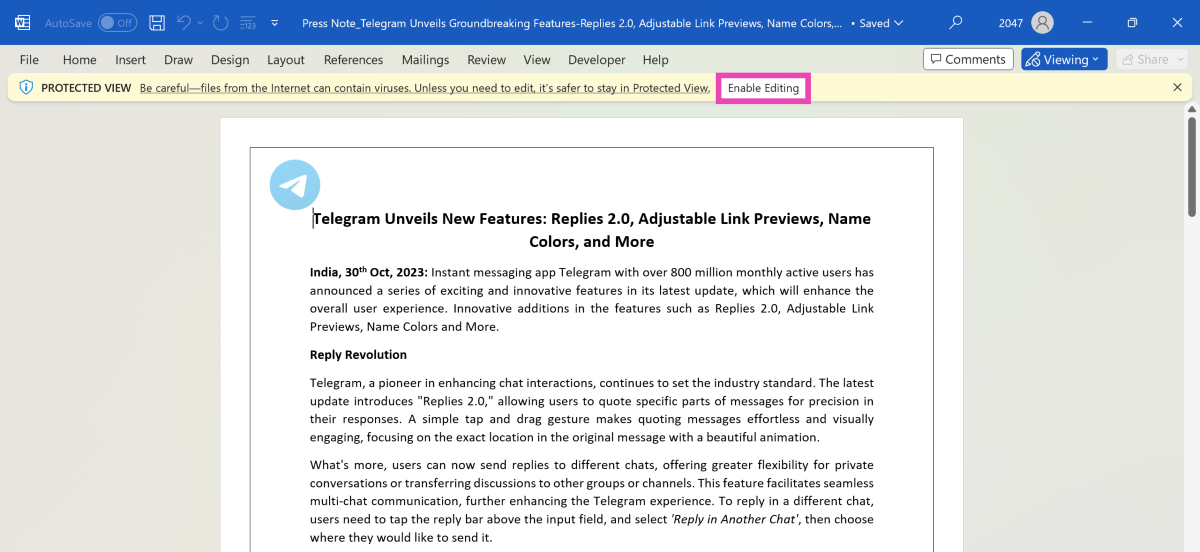 また、ユーザーは、インターネットからダウンロードしたWord文書の編集制限にも出くわします。これは、Microsoft WordがウイルスからPCを保護するために取られた予防措置です。かなり無害だと思うので、ユーザーにワードファイルをダウンロードさせるのは驚くほど簡単です。ただし、悪意のあるエンティティはまだシステムに入り込むことができます。 Microsoft Wordの「保護されたビュー」機能は、読み取り専用モードでファイルを開くことでこれが発生するのを防ぎます。