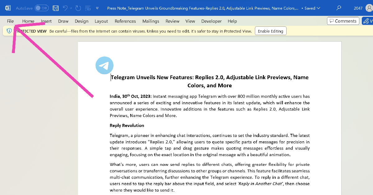 ウェブからダウンロードされたドキュメントで編集を制限して、保護されたビュー。これは、PCをウイルスから保護するために行われます。単語の編集制限を削除するには、に進みますファイル>情報そしてヒット編集を有効にしますで保護されたビュー箱。