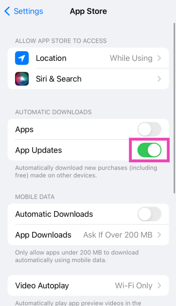 行きます設定>アプリストア自動ダウンロードの下でアプリの更新の横にあるトグルスイッチをオンにします。