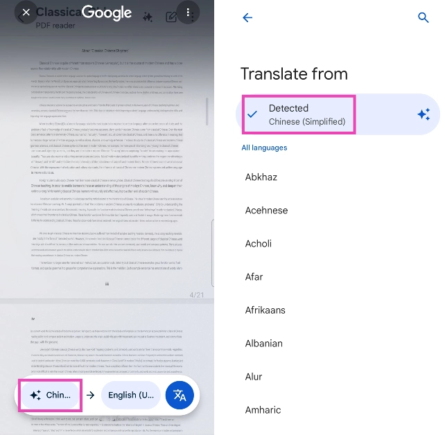 ステップ4:Circle to Searchは、テキストを目的の言語に変換します。テキストの言語はバブル画面の下部に。バブルをタップして、検出された言語を表示します。