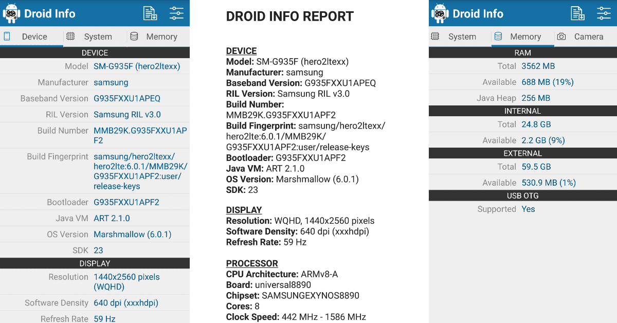 デバイス情報を簡単に明らかにできるサードパーティのアプリがたくさんあります。このタスクに最適なアプリの1つです。携帯電話にアプリをインストールしたら、適切に機能するために必要な許可を与えます。アプリを起動すると、システム、メモリ、カメラなどに関連するすべてのデバイス情報が表示されます。アプリは、モデル番号、ビルド番号、OSバージョン、メーカーの名前、ビルドフィンガープリント、およびその他の情報を表示します。