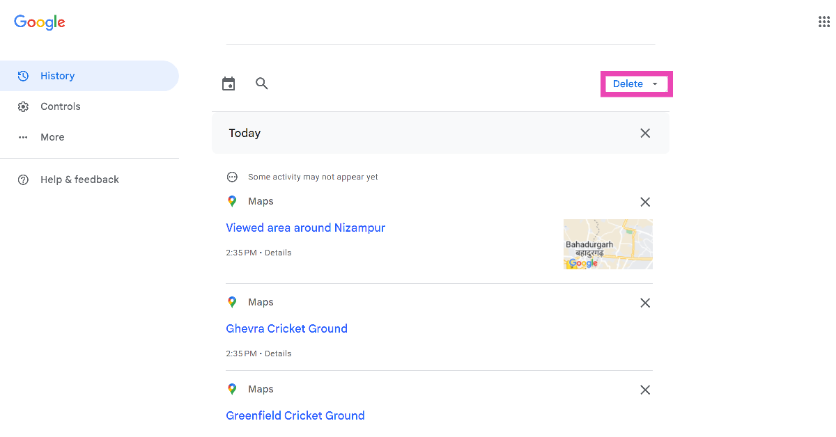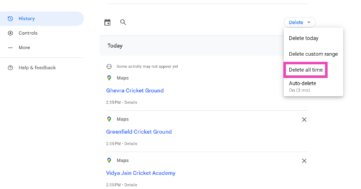 PCのWebブラウザを使用してGoogleマップに移動し、ハンバーガーメニューを押し、「マップアクティビティ」を選択し、「削除」というドロップダウンメニューを押して、「すべて削除」を選択します。