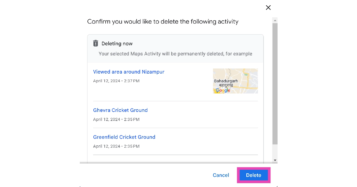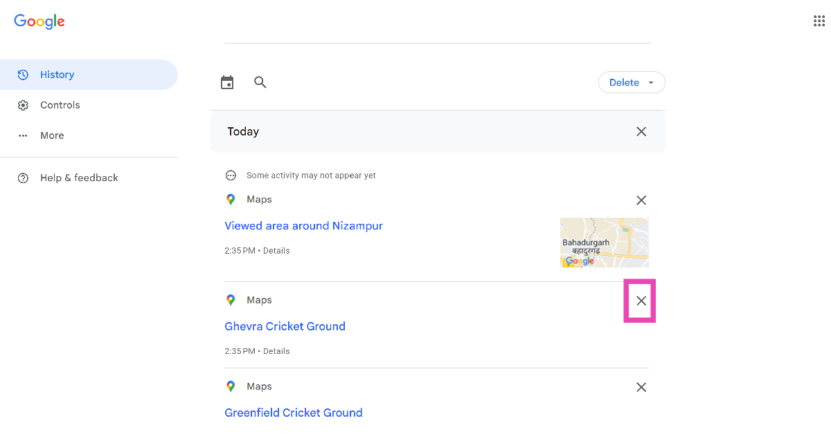 ステップ5:ヒットしますクロスアイコン場所の隣取り除くGoogleマップの歴史から。