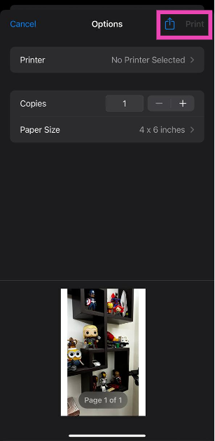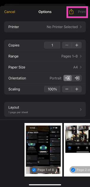 ステップ7:をタップします印刷画面の右上隅にあるオプションと選択ファイルに保存しますポップアップメニューから。