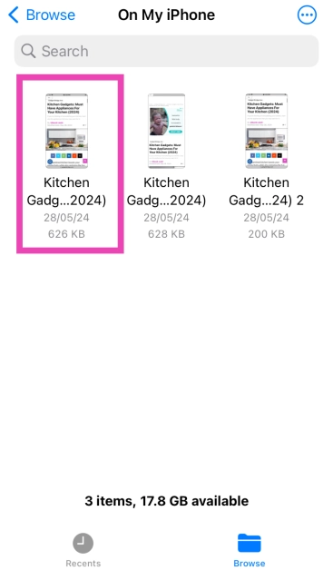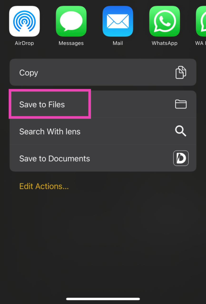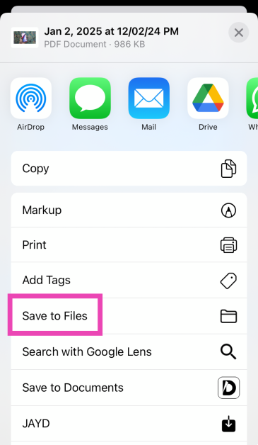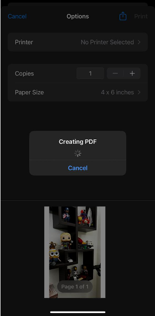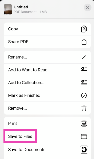 ファイルアプリに移動し、変換するファイルを選択し、共有アイコンをタップし、[印刷]を選択し、[印刷]コマンドをタップしてから、再び共有アイコンを押して、携帯電話に保存します。