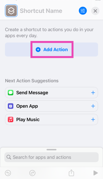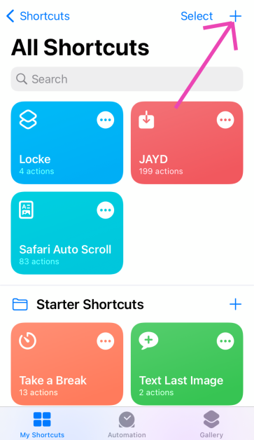 ステップ1:起動しますショートカットアプリiPhoneでタップしますプラスアイコン画面の右上隅に。