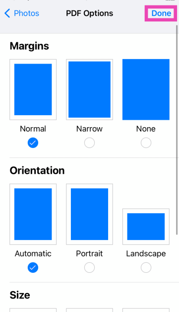 ステップ5:マージン、方向、サイズを選択します。打つ終わり。