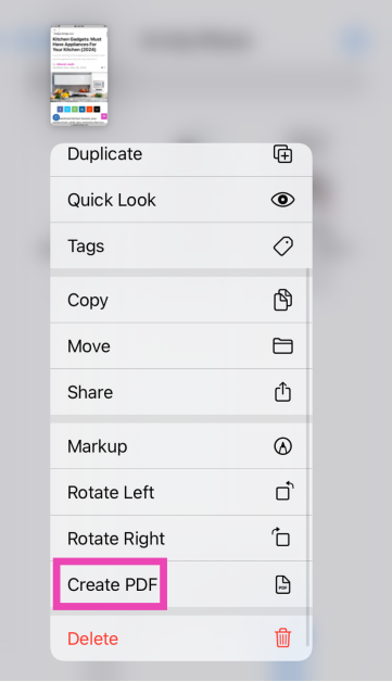 一度に多数の画像をPDFに変換するには、それらをすべて選択し、画面の右下隅で「more」をタップし、PDFの作成を選択します。
