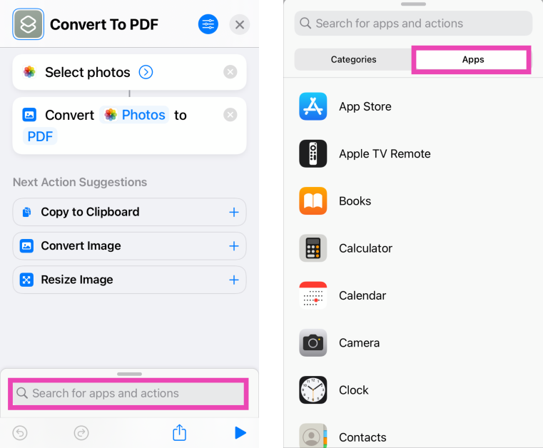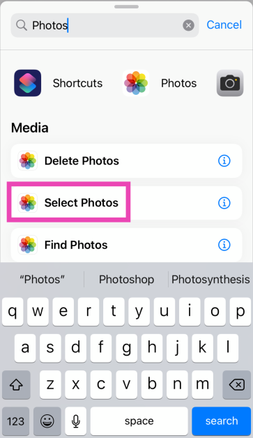 ステップ3:を検索します写真アプリタップします写真を選択しますアクション。