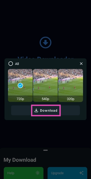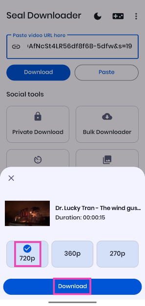 Google Playストアから携帯電話にシールダウンロードアプリをインストールします。テキストボックスにビデオリンクを貼り付けて、「ダウンロード」を押します。解像度を選択し、「ダウンロード」を再度押します。