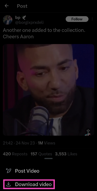 Twitter Blue/X Premiumサブスクライバーの場合は、アプリ自体から動画をネイティブにダウンロードできます。仕事をするためにサードパーティのアプリやオンラインツールは必要ありません。ただし、知っておく必要がある小さなキャッチが1つあります。プラットフォームでビデオを公開するX/Twitterユーザーは、他のユーザーがビデオをダウンロードできるかどうかを判断できます。彼らがこの機能をオフにした場合、ブルー/プレミアムの購読者でさえビデオを保存することはできません。これにより、サードパーティのツールに頼ることができます。また、ネイティブダウンロード機能がまだPCで使用できないことを知っておく必要があります。