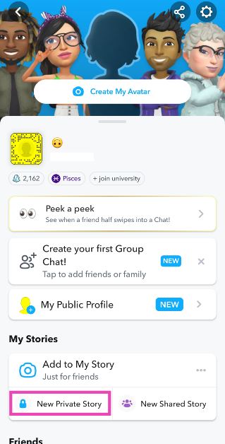 ステップ2:タップします新しいプライベートストーリー。