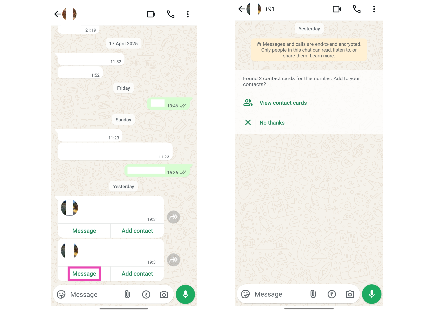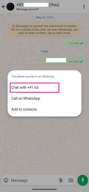 ステップ3:WhatsAppアプリで新しいチャットスレッドが開きます。メッセージを送信します救われていない番号に。