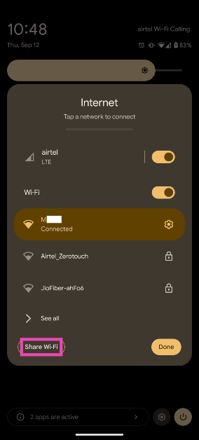 ステップ3:スマートフォンがWiFiネットワークに接続されていることを確認してください。タップしますWi-Fiを共有します。