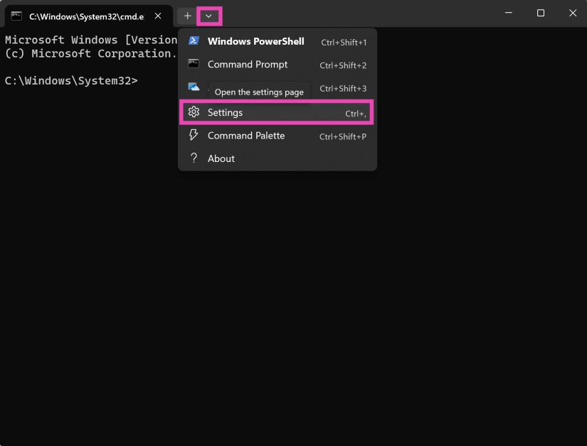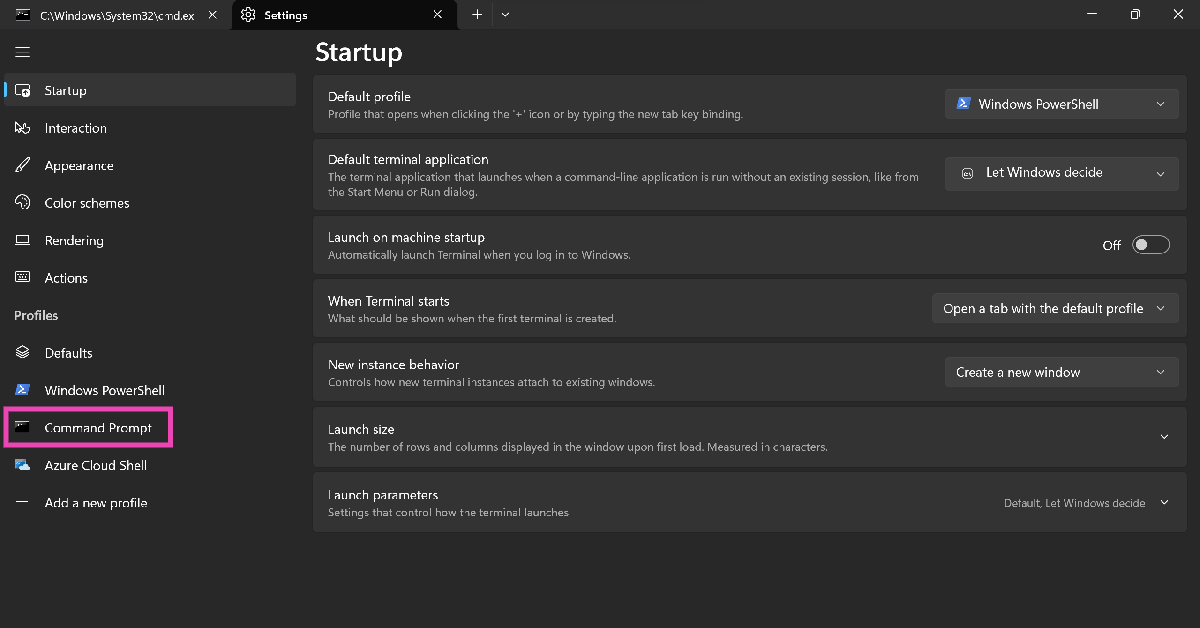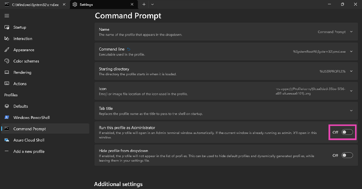 ターミナルを開きます設定>コマンドプロンプト「管理者としてこのプロファイルを実行する」ためにトグルスイッチをオンにします。