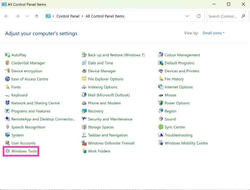 ステップ1:開きますコントロールパネルコンピューターで選択しますWindowsツール。