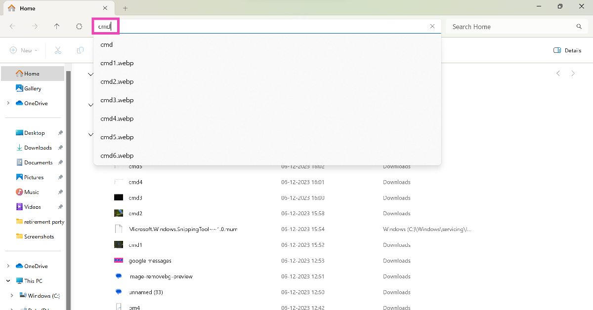 ステップ2:アドレスバーをクリックして入力してください 'CMD'。打つ入力。