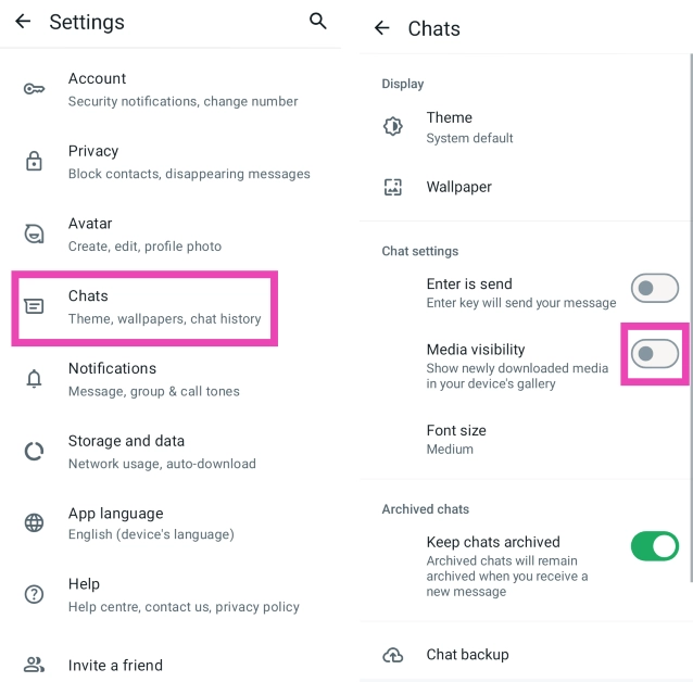 WhatsAppの設定で「メディアの可視性」をオフにすると、送信された写真やビデオはデバイスのギャラリーに表示されません。行きますWhatsApp>設定>チャットメディアの可視性の横にあるトグルスイッチをオンにして、ギャラリーアプリでWhatsAppメディアを表示します。