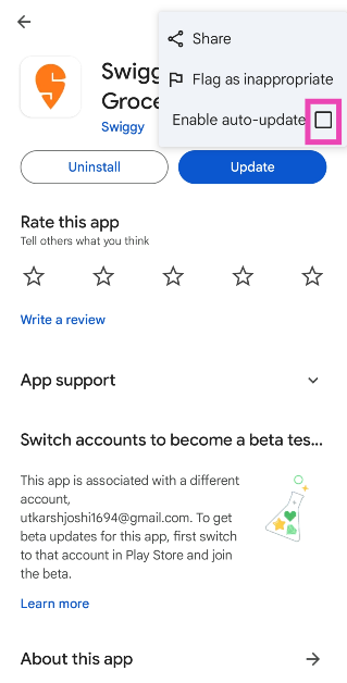 単一のアプリの自動更新をオンにするには、Google Playストアでページを開き、画面の右上隅にあるEllipsesをタップし、[自動更新を有効にする]のチェックボックスを選択します。