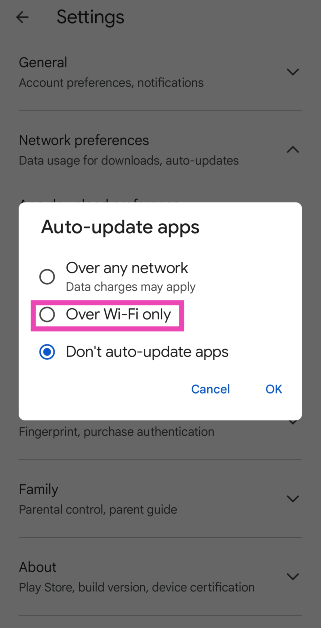 ステップ6:タップしますwi-fiのみ。モバイルインターネットよりもアプリを更新することもできますが、このオプションは多くのモバイルデータを使用することになるため推奨されません。
