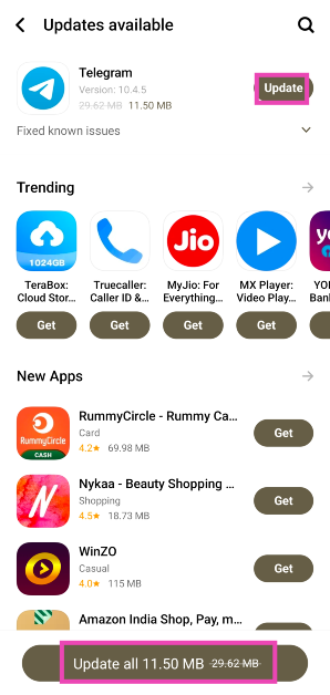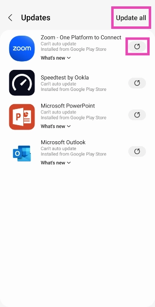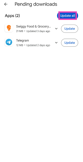 ステップ4:タップしますアイコンを更新します更新または選択するアプリの横にありますすべてを更新します画面の右上隅に。