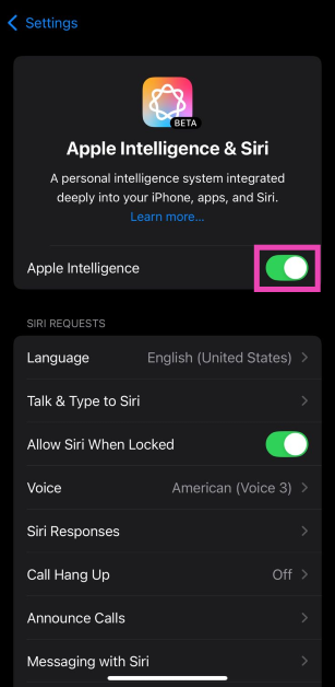 ステップ2:次のトグルスイッチをオンにしますApple Intelligence。