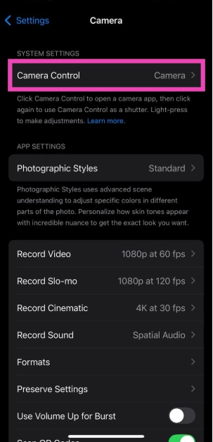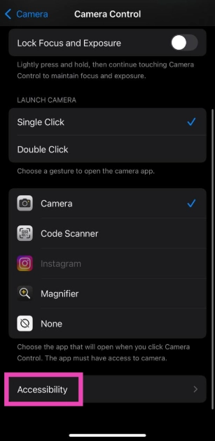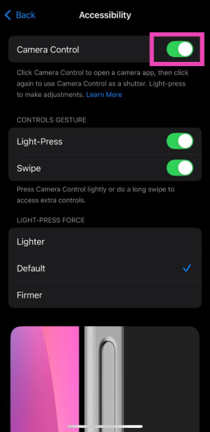 iPhoneでカメラコントロールを動作させることができない場合は、設定>カメラ>カメラ制御>アクセシビリティトグルスイッチをオンにします。さらに、iPhoneのカバーがボタンを妨げていないことを確認してください。