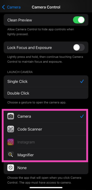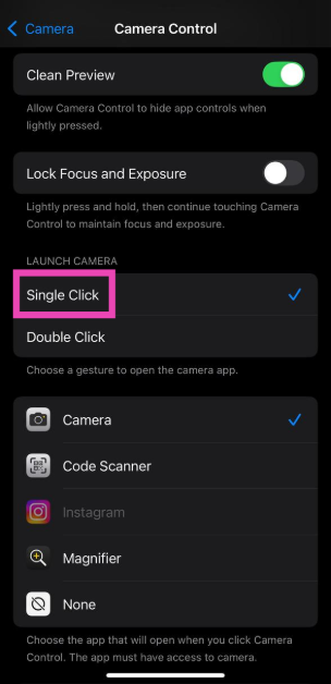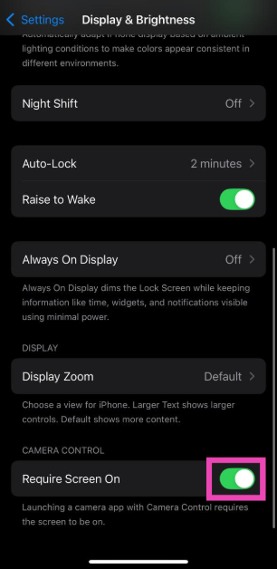 行きます設定>カメラ>カメラ制御「シングルクリック」をタップします。さらに、に移動します設定>明るさと表示カメラ制御下で「画面を必要とする」の横にあるトグルスイッチをオンにします。