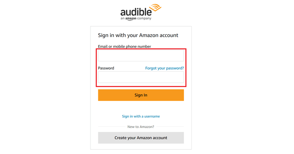 ステップ1:Audible/Amazonアカウントの資格情報を使用してサインインします。まだログインしていない場合は、Audible Webサイトにアクセスして、アカウントの詳細を入力してください。
