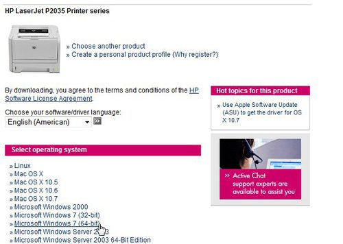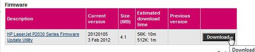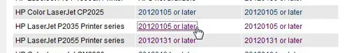 たとえば、私が持っている影響を受けるプリンターの1つは、HP LaserJet P2035です。テーブルにリンクがある2つの列がありますが、いずれかの列のリンクをクリックして、HP LaserJetファームウェアを更新する必要があるファイルにアクセスできます。