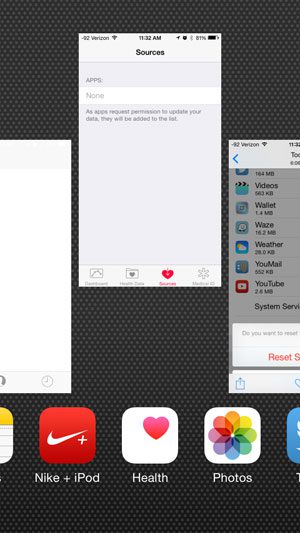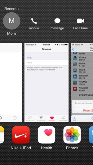 アプリスイッチャーは、iOS 8のアップデートも受け取り、最新のお気に入りの連絡先を画面上部に連続して追加しました。アプリスイッチャー画面の上部にある連絡先名のいずれかをタップするだけで、その人に連絡するために使用できるさまざまな方法の選択が与えられます。