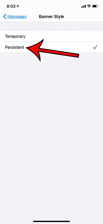 私たちのガイドは、iPhoneでバナースタイルが何を意味するか、および永続的なバナーiPhoneメッセージ通知または一時バナーiPhoneメッセージ通知を使用する方法に関する追加情報を以下に続けます。