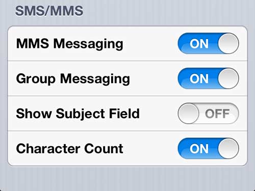iPhone 5メッセージ設定メニューを開きますステップ3:画面の下部にスクロールし、次にボタンを押します文字カウントそれが言うようにの上。