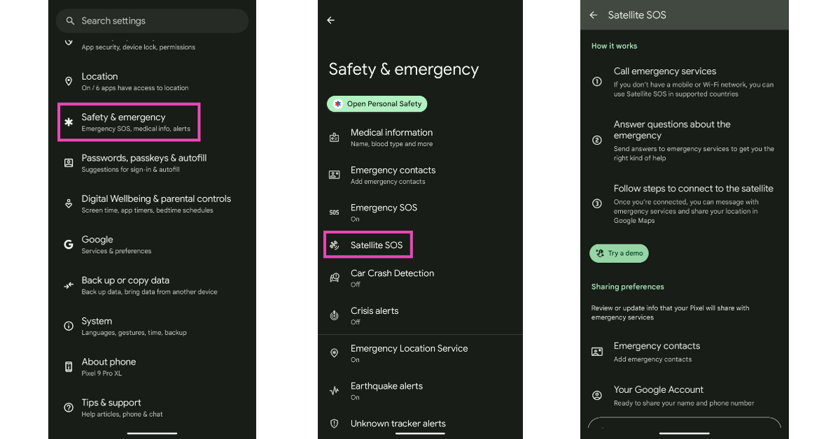 Google Pixel 9は、緊急の場合に衛星SOSを使用して衛星に接続し、情報を地元の緊急サービスに伝えます。