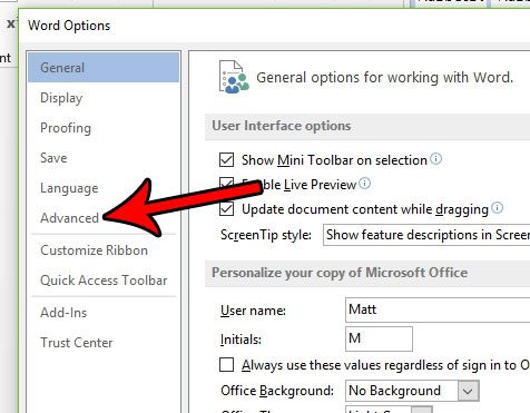 ステップ4:クリックします高度なの左列のタブ単語オプションウィンドウ。