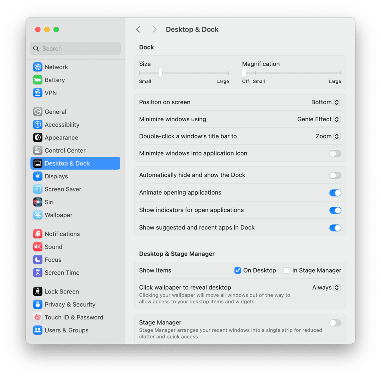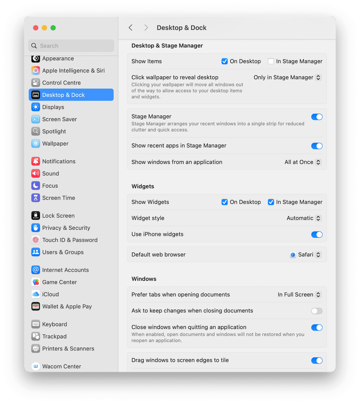 - デスクトップにウィジェットがあり、ステージマネージャーでそれらを見たい場合は、デスクトップ&ドックのウィジェットセクションにアクセスして、「ウィジェットを表示」の横にある「ステージマネージャー」を選択してください。