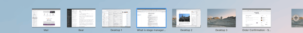 Stage Managerは、MACOSの機能であり、生産性を高め、デスクトップを整理するのに役立つように設計されています。作業中のアプリを画面の中央に置き、最近使用したアプリのサムネイルを画面の左側に配置します - ステージ外です。画面の中央にあるグループに複数のアプリを配置し、必要に応じてウィンドウをサイズ変更またはオーバーラップできます。グループに切り替えると、グループ内のすべてのアプリが画面の中央で開きます。