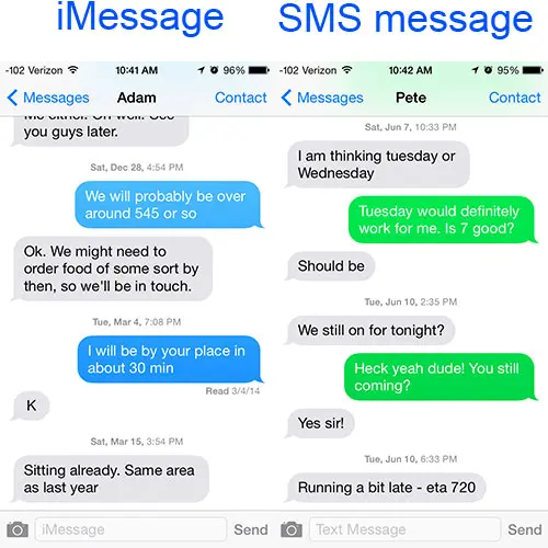 青いメッセージは実際にはiMessageであり、以前の非アプル携帯電話で送信および受け取った標準テキストメッセージとはわずかに異なります。