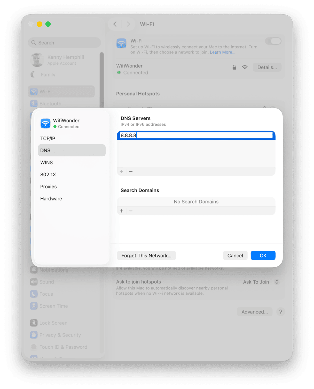 - DNSセクションで、[ +]をクリックして新しいサーバーを追加します。