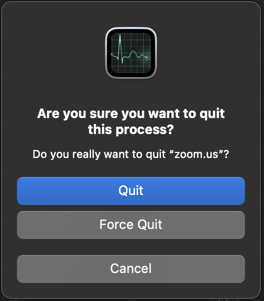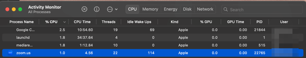 閉じたいアプリケーションを見つけて、そのPIDに注意してください。 22765のPIDでズームアプリケーションを探しています。アクティビティモニターが同じPIDを示していることに注意してください。