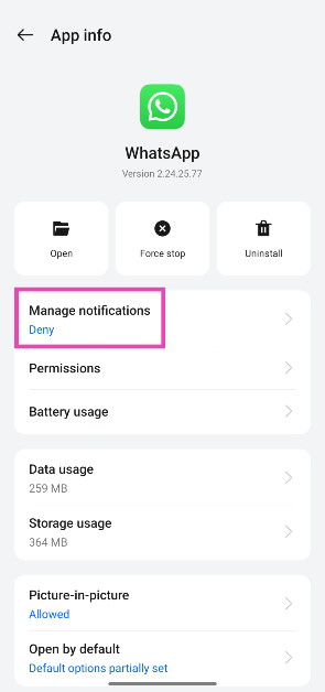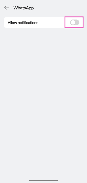 行きます設定>アプリ> whatsapp>通知を管理しますそして、「許可しないでください」の横にあるトグルスイッチをオンにします。