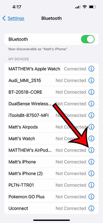 Bluetoothメニューに入ったら、現在iPhoneとペアになっているすべてのデバイスのリストが表示されます。名前を変更したいデバイスを探し、その横にある「i」アイコンをタップします。